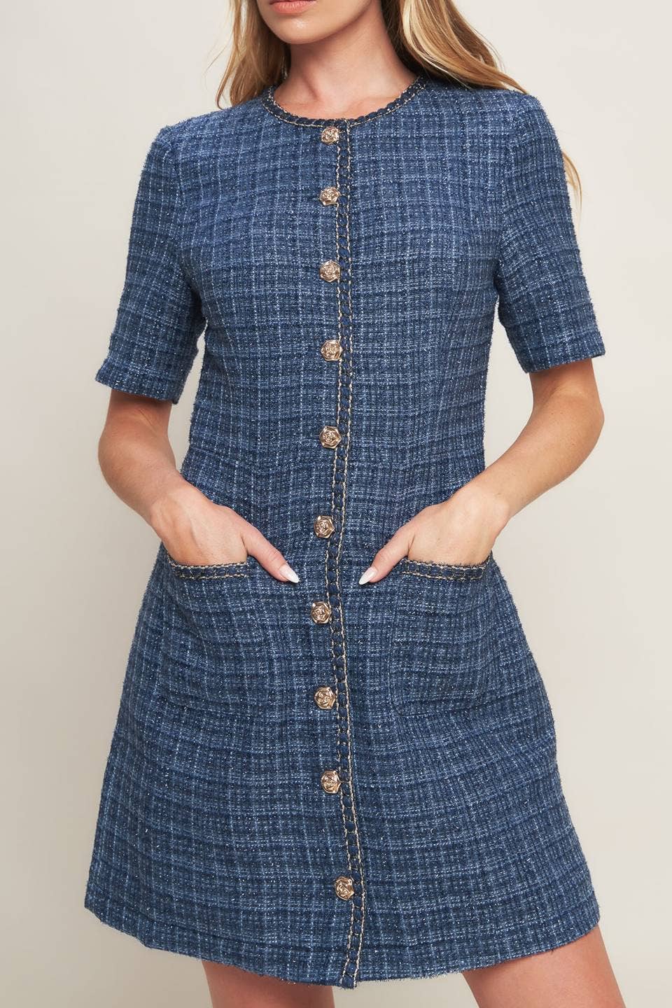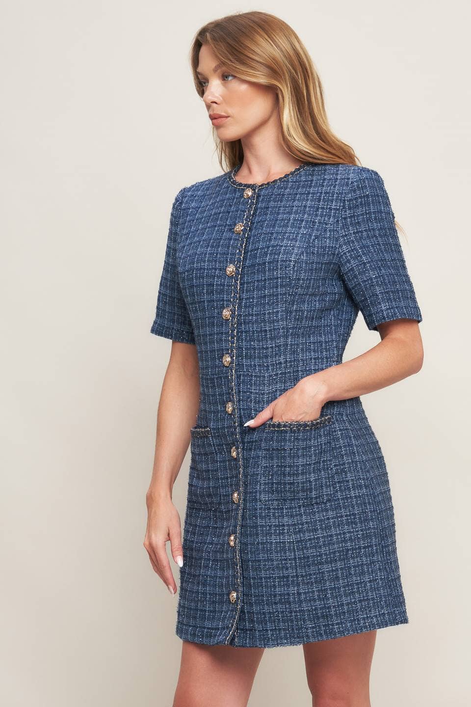 A tweed mini dress featuring round neckline, short sleeve, front button down with chain trimmed edge and pockets