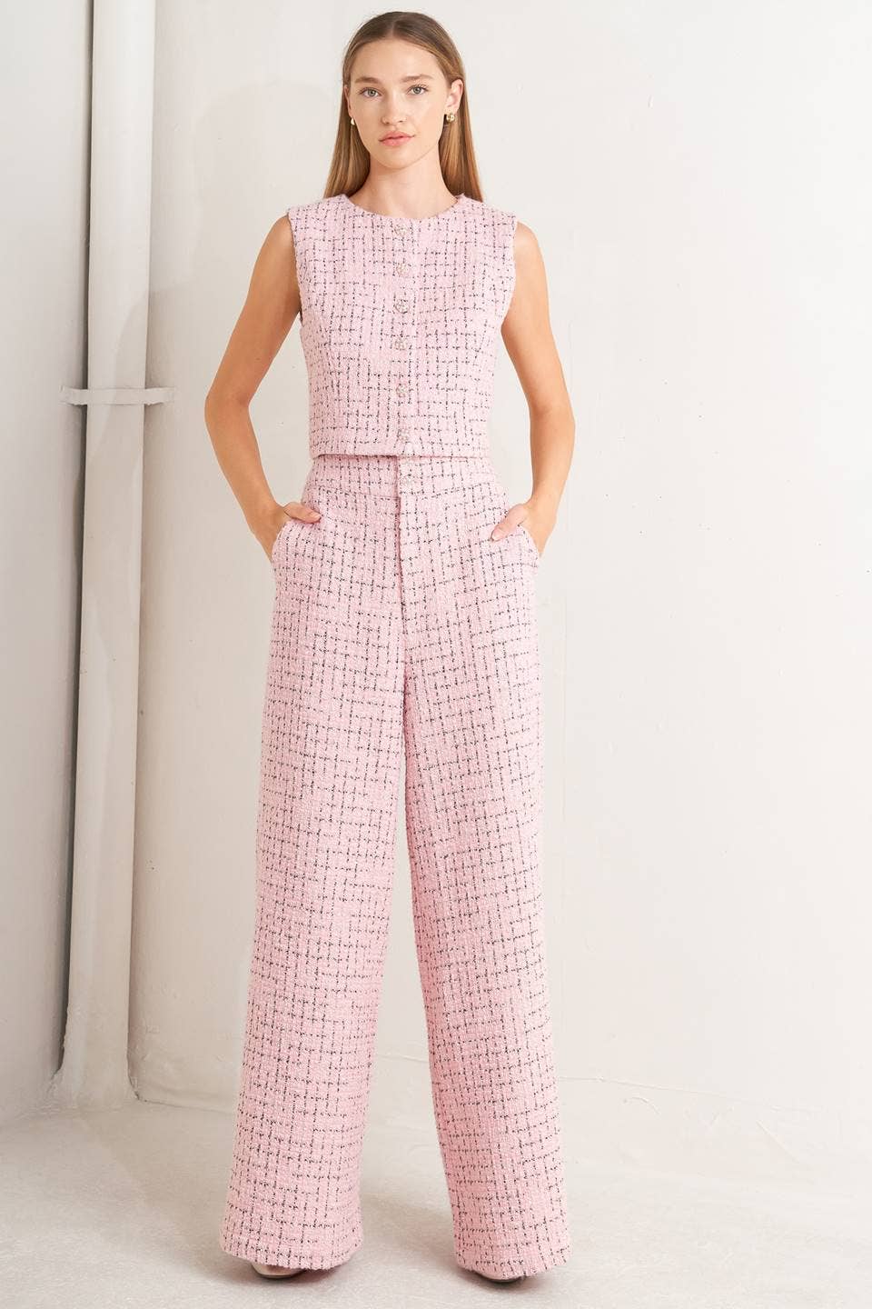 A tweed pant featuring front closure, pockets and wide leg. Matching FJ1329 Details: Self : 90% Polyester 10% Cotton Lining : 100% Polyester Size & Fit - Model is 5`8" And Wearing Size Small - Measurements Taken From Size Small - Approx. Length: 46"