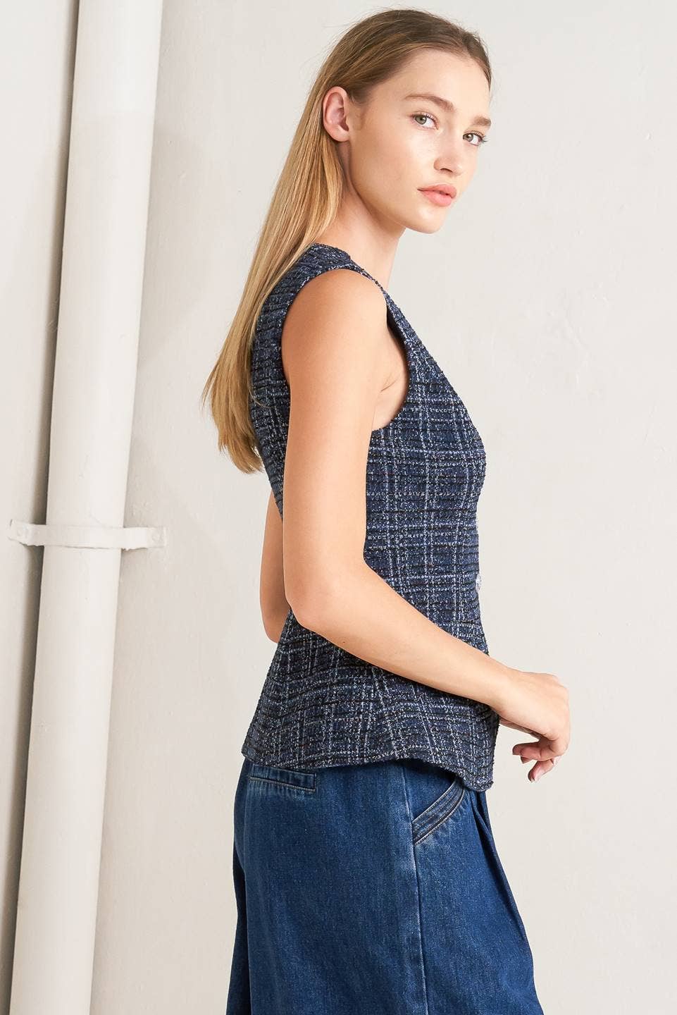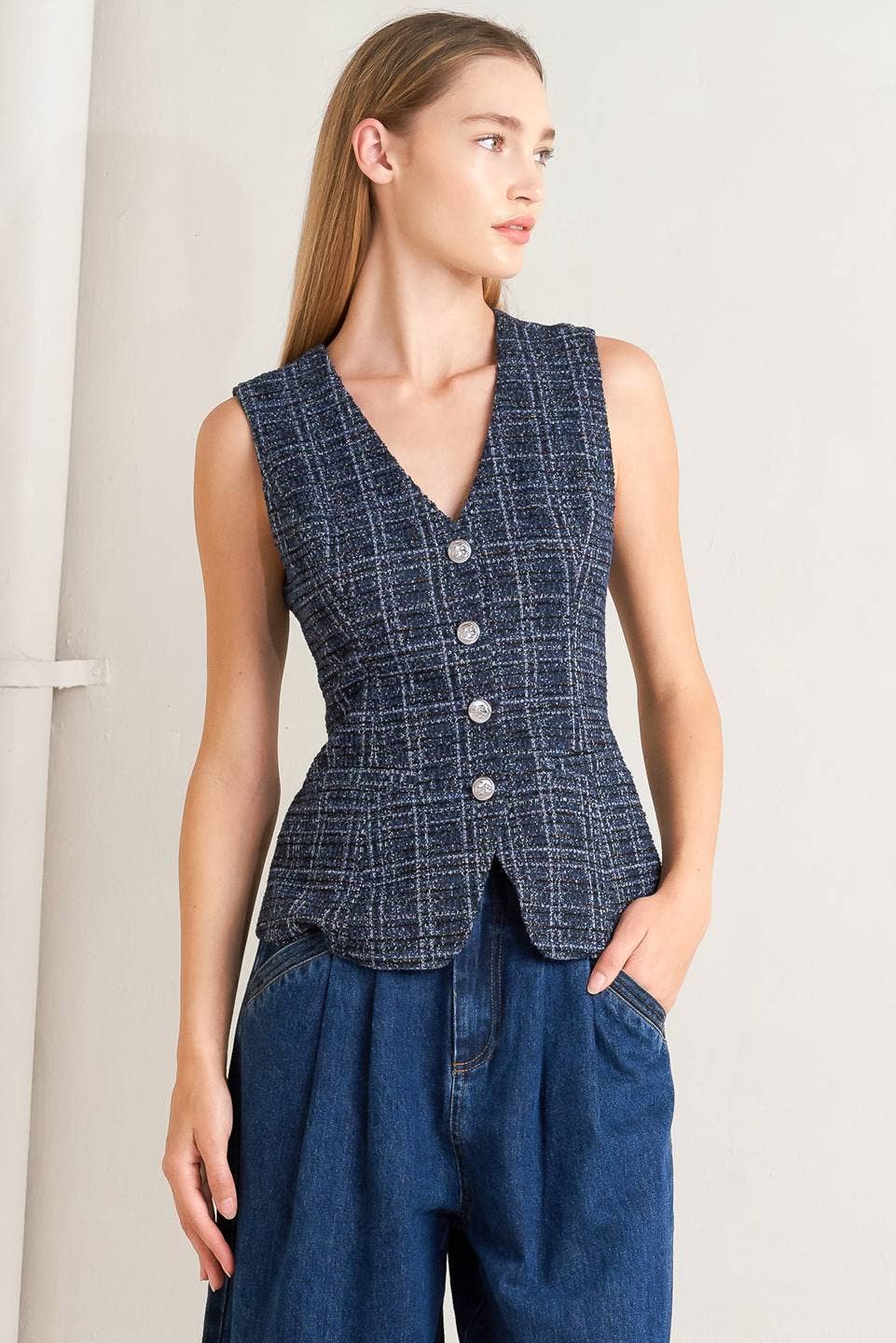 A tweed vest with front button closure Details: Self : 100% Polyester Lining : 100% Polyester Size & Fit - Model is 5`8" And Wearing Size Small - Measurements Taken From Size Small - Approx. Length: 26"
